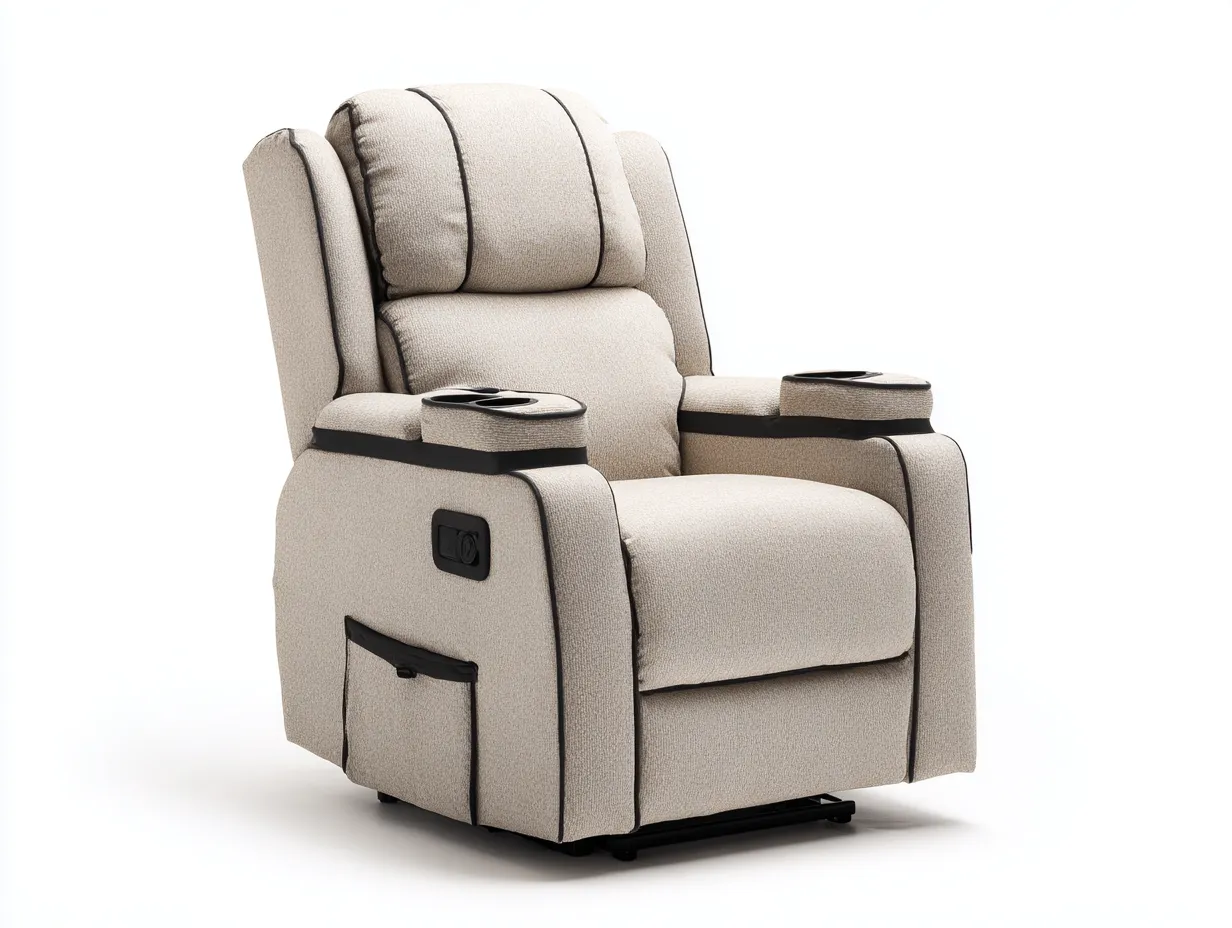 El mecanismo reclinable permite ajustar la posición para disfrutar de un descanso más relajado. Los reposabrazos incorporan portavasos integrados que resultan prácticos para bebidas durante el descanso. Además el bolsillo lateral permite guardar objetos pequeños como mandos o revistas manteniéndolos siempre a mano.