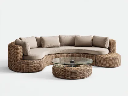 El sofá de diseño curvo permite acomodar cómodamente a varias personas ofreciendo un espacio ideal para conversar o descansar. Los cojines proporcionan mayor comodidad mientras que la mesa central resulta práctica para colocar bebidas o pequeños objetos.